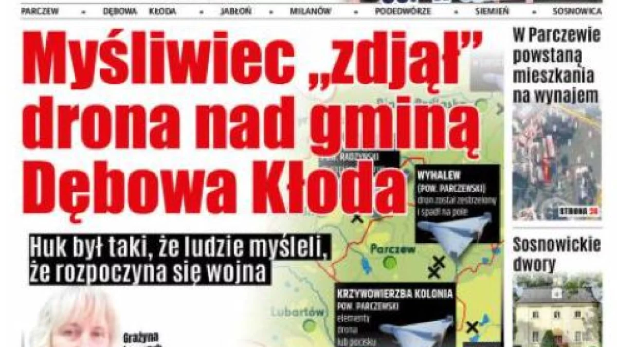 Nad wsią Wyhalew w gminie Dębowa Kłoda myśliwiec zestrzelił obcego drona. Szczątki znaleziono także w niedalekiej Krzywowierzbie-Kolonii. - Wybuchy były silne - relacjonowała Grażyna Lamczyk, wójt gminy Dębowa Kłoda.