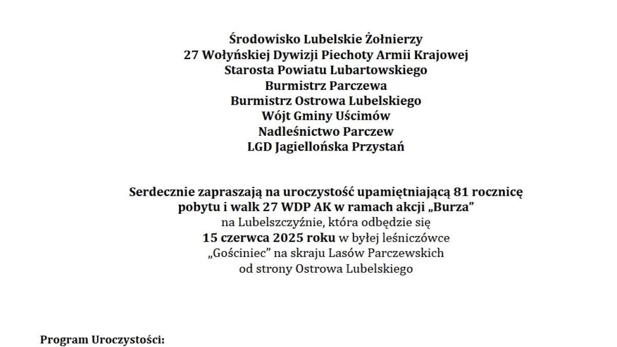 Godz. 10.45 - Zbiórka pocztów sztandarowych przy pomniku-tablicy upamiętniającej szlak bojowy 27 WDP AK