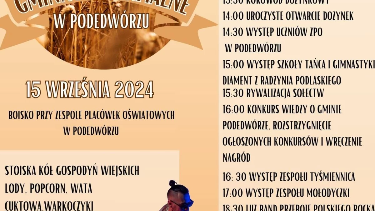 O godzinie 12.30 planowana jest msza święta w intencji rolników, po której korowód dożynkowy przejdzie na plac przy Zespole Placówek Oświatowych (program wydarzenia widoczny na plakacie). O godz. 20.30 planowana jest zabawa z DJ-em, a impreza zakończy się o godz. 23.