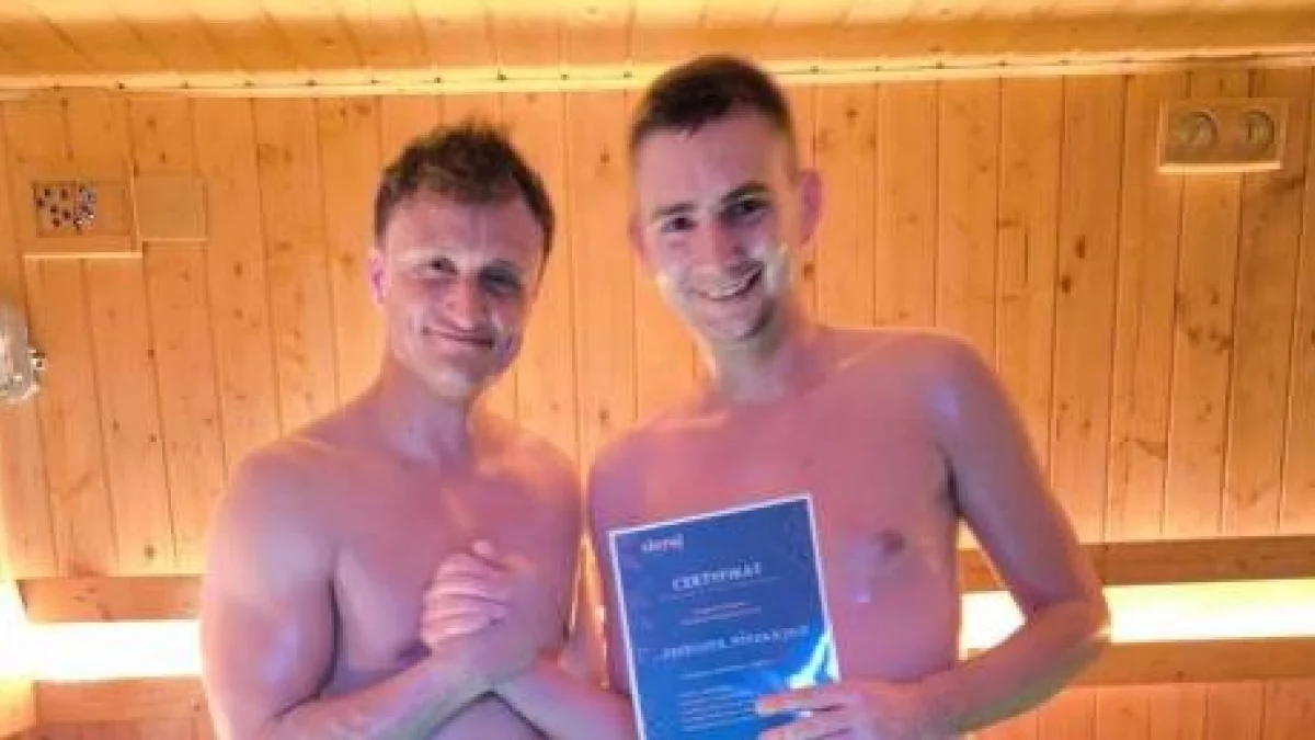 Zdj. Wice Mistrz Świata Saunamistrzów we Freestylu i Mistrz Polski Saunamistrzów Radosław Sieraj oraz Grzegorz Mikołajko z certyfikatem po zdanym egzaminie na saunomistrza
