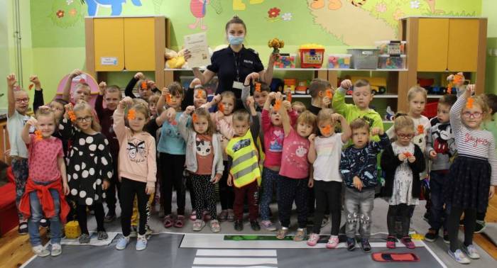 Policjantka, która odwiedziła przedszkolaków, zwracała szczególną uwagę na noszenie przez dzieci elementów odblaskowych nie tylko w nocy, ale również w jesienne popołudnia, kiedy szybko zaczyna zapadać zmrok. – Każdy malec staje się bardziej widoczny dla kierujących pojazdami oraz innych uczestników ruchu drogowego – przypomina E. Semeniuk. Oprócz tego dzieci z zainteresowaniem słuchały, jak funkcjonariuszka czytała im fragment książki podsumowujący omówione zagadnienia. Na koniec każdy z maluchów otrzymał odblaskowy upominek.