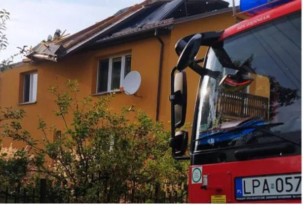 Zerwany fragment dachu częściowo runął na ziemię uszkadzając linie energetyczną, a częściowo zawinął się i "oparł" na pozostałej konstrukcji zagrażając osunięciem na ziemię. – Nasze działania polegały na zabezpieczeniu miejsca zdarzenia i stopniowej rozbiórce uszkodzonego fragmentu. Następnie przy pomocy desek oraz plandek zabezpieczono budynek przed deszczem – dodają strażacy.
