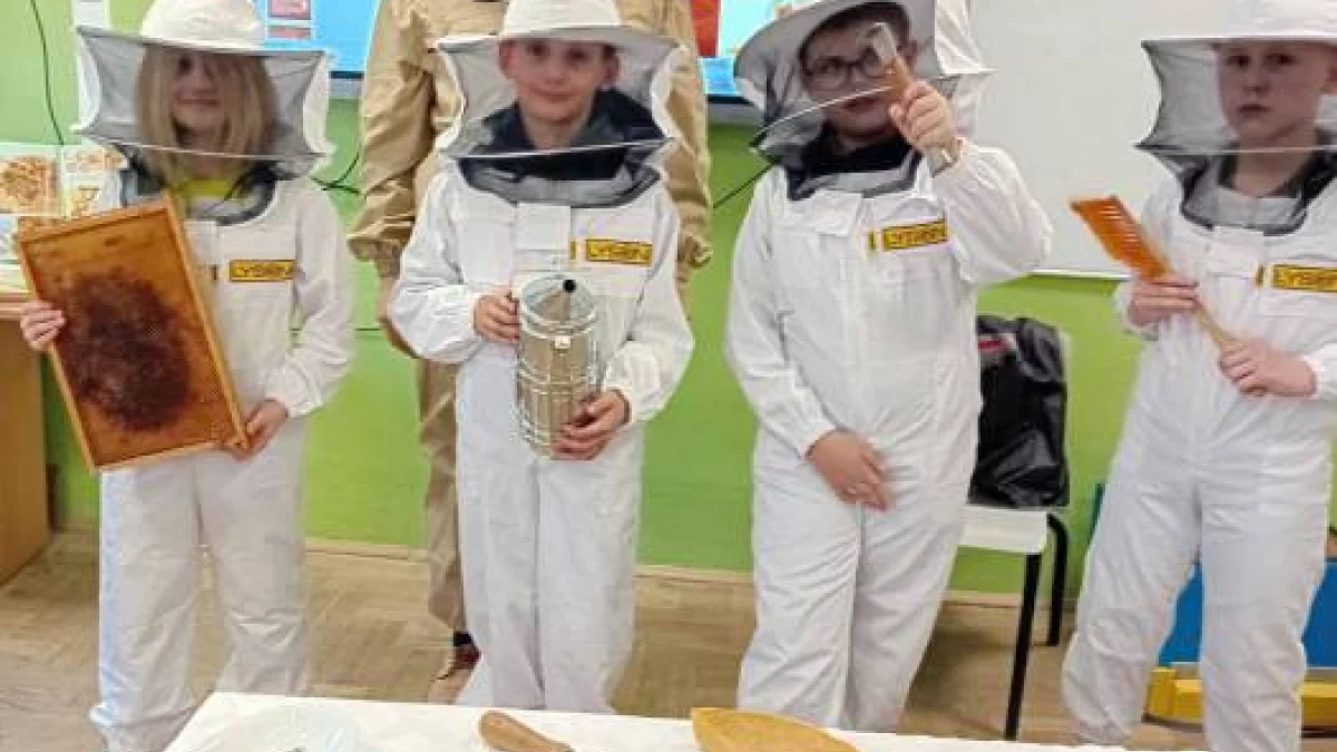 Nie zabrakło również słodkiej atrakcji – degustacji różnych rodzajów miodu, która sprawiła dzieciom wiele radości. Największą frajdą było jednak przymierzanie prawdziwych kombinezonów pszczelarskich, dzięki czemu uczniowie mogli choć przez chwilę poczuć się jak prawdziwi pszczelarze.
