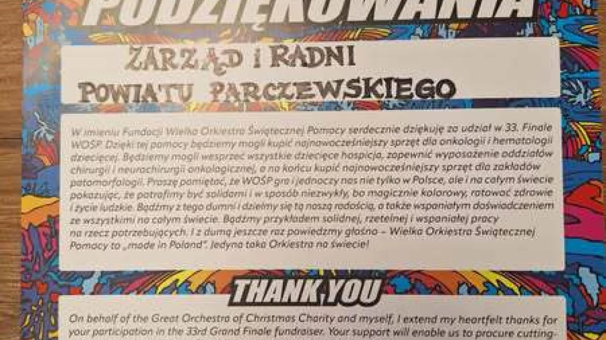 Starosta Janusz Hordejuk odpowiedział, że Zarząd Powiatu poprosił dyrektor Powiatowej Biblioteki Publicznej - Centrum Kultury w Parczewie, aby włączyła się do finału. Dyrektor przekazała eksponaty na licytację. Dodatkowo członkowie Zarządu i prezydium zakupili złote serduszko, które zostało przekazane na licytację.