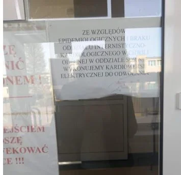 Z kolei Jarosław Ostrowski, który od połowy marca jest p.o. dyrektora parczewskiego szpitala, przyznaje, że taka kartka została wywieszona przed wejściem na SOR, choć osobiście jej nie widział. – Z informacji, które do mnie dotarły, wynika, że kartka pojawiła się dość dawno temu, kiedy oddział internistyczno-kardiologiczny był przekształcony w oddział covidowy i nie została w odpowiednim momencie zdjęta. Jej wywieszenie nie było uzgodnione z dyrekcją – mówi Ostrowski i zapewnia, że SOR funkcjonuje normalnie. Działa też oddział interny, choć ma problemy z obsadą lekarską.