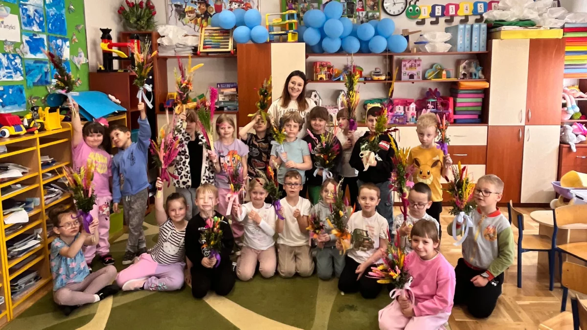 Pod czujnym okiem specjalistki od florystyki, zerówkowicze własnoręcznie tworzyły palmy wielkanocne – piękne, kolorowe kompozycje z suszonych traw, kwiatów i bazi. Dzieci z ogromnym zaangażowaniem dobierały elementy, układały je i wiązały w swoje małe dzieła sztuki.