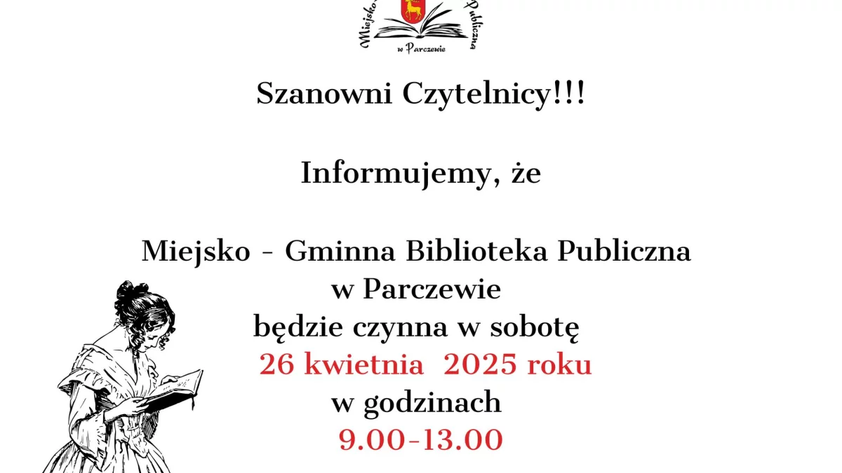 Informacje parczewskieMiejsko-Gminna Biblioteka Publiczna w Parczewie będzie czynna w sobotę, 26 kwietnia. Godziny otwarcia to 9-13.