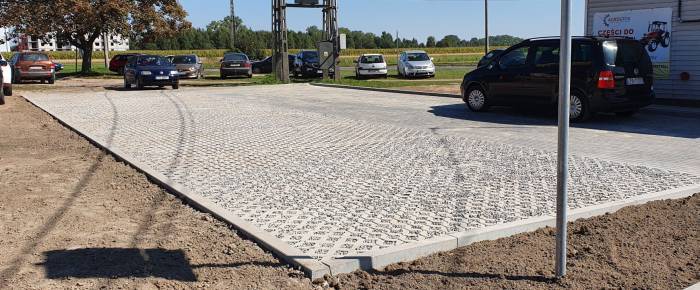 Nowe miejsca postojowe zostały wykonane z płyt ażurowych o wymiarach 60x40 cm. Zajmują powierzchnię prawie 13 arów. Ułożony został też chodnik z kostki betonowej o łącznej powierzchni ponad 3 arów. Z tego samego materiału została wykonana droga wewnętrzna. Wykonawca ustawił również nowe krawężniki, a także wykonał nowe oznakowanie.
