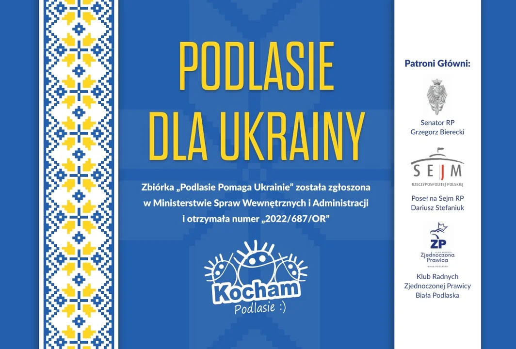Zbiórka "Podlasie Pomaga Ukrainie" została zgłoszona w Ministerstwie Spraw Wewnętrznych i Administracji i otrzymała numer "2022/687/OR"
