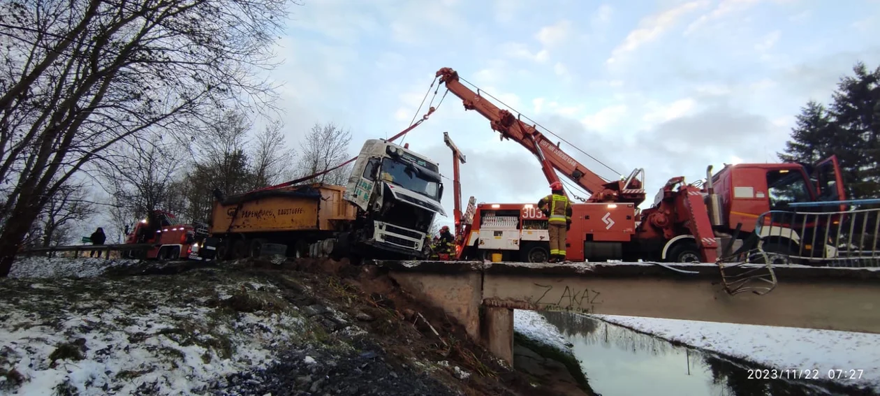 Samochód przewoził odpad kopalny, którego część rozsypała się na nasypie kanału. - Ze względu na zagrożenie ekologiczne podjęto decyzję o wyciągnięciu zestawu z kanału - dodaje KP PSP w Parczewie.