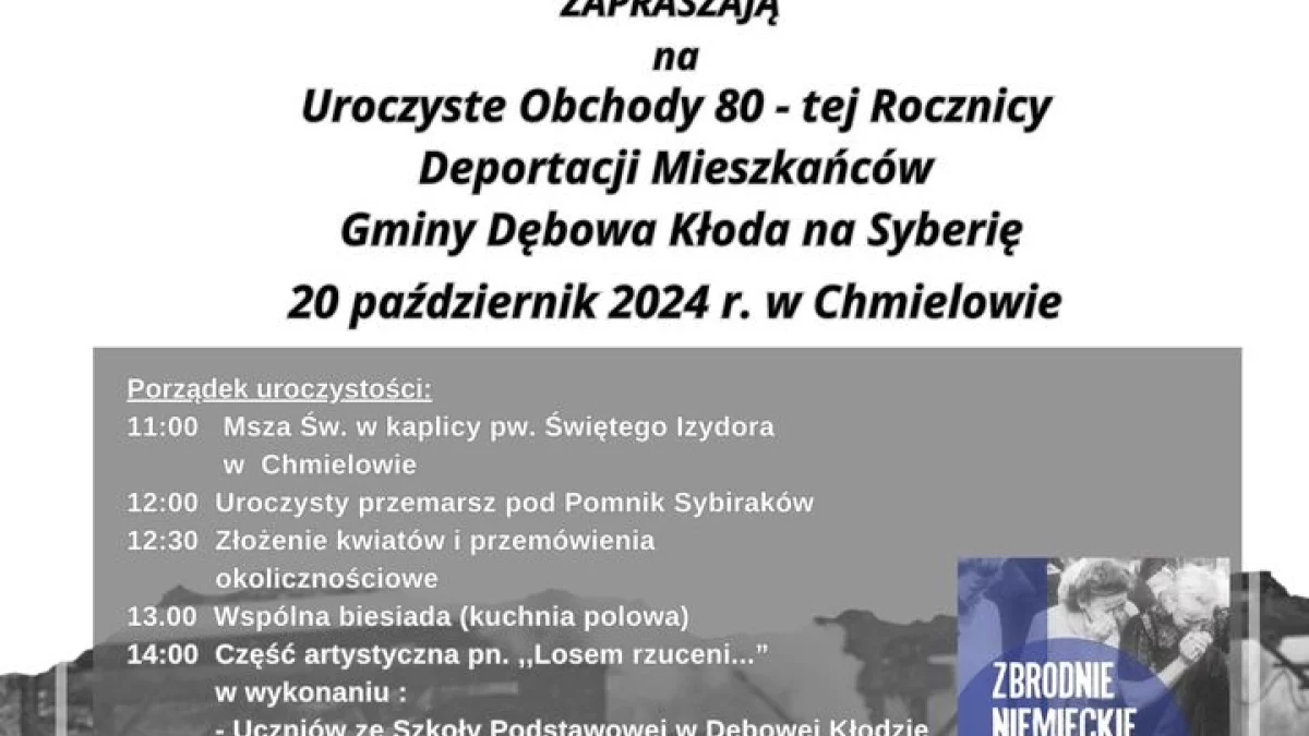 Obchody zaczną się o godz. 11 od mszy św. w kaplicy w Chmielowie. Na godz. 12 planowany jest uroczysty przemarsz pod Pomnik Sybiraków. Przewidziano złożenie kwiatów, przemówienia okolicznościowe i wspólną biesiadę (kuchnia polowa). O godz. 14 zacznie się część artystyczna pt. „Losem rzuceni”.