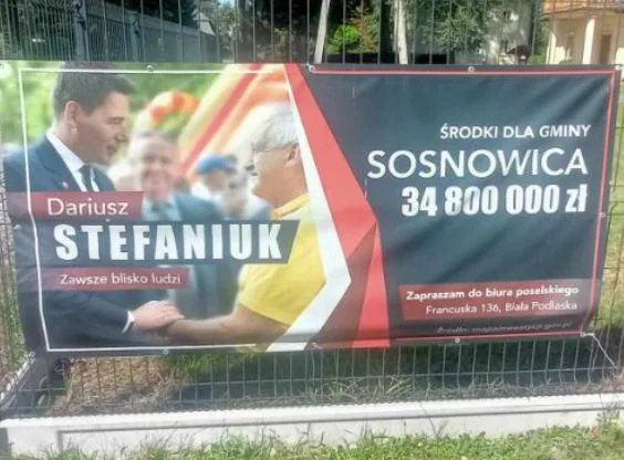 W ostatnich tygodniach w Sosnowicy, nieopodal Dworku Kościuszki, stał baner wyborczy Stefaniuka. Widać na nim zdjęcie parlamentarzysty, który rozmawia z innym mężczyzną, "zwykłym wyborcą". Baner został okraszony podpisem "środki dla gminy Sosnowica – 34,8 mln złotych".
