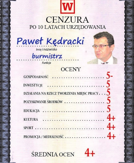 W okresie 10 lat kierowania Gminą przez Pana Kędrackiego, podejmowano wiele słusznych, poprawiających wizerunek miasta i komfort życia mieszkańców działań, niestety Finansowanie części z nich pokrywano w całości ze środków własnych, co spowodowało znaczne zadłużenie Gminy. Jednostki organizacyjne Gminy działają w rozsądnych ramach organizacyjno – strukturalnych, co jest aspektem pozytywnym.