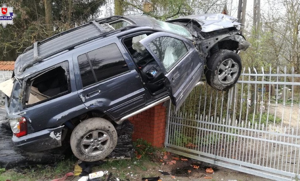 Jak ustalili interweniujący policjanci, kierujący pojazdem marki Jeep stracił panowanie nad swoim autem. Jego „terenówka” uderzyła w ogrodzenie, następnie dachowała, a na koniec zawisła na bramie wjazdowej.