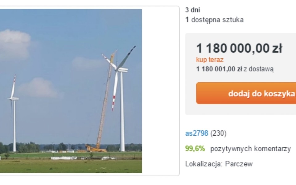 W ubiegłym tygodniu na popularnym serwisie aukcyjnym w kategorii - Alternatywne źródła energii - pojawiła się oferta sprzedaży "Vestas V80 2 MW Turbina Elektrownia Wiatrowa". W opisie czytamy: "Turbina na sprzedaż: Vestas V80, 2 MW, rok prod. 12/2003 już w Polsce w miejscowości Parczew (wschód Polski, więc idealnie dla inwestycji na Ukrainie lub Białorusi).