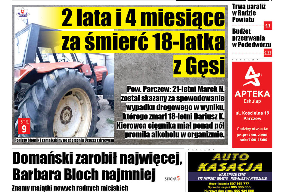 Bialski sąd skazał 21-letniego Marka N. z gminy Jabłoń na karę dwóch lat i czterech miesięcy więzienia za spowodowanie wypadku, w wyniku którego zmarł 18-letni Dariusz K. Sąd zakazał też Markowi N. kierowania wszelkimi pojazdami mechanicznymi dożywotnio. Ponadto 21-latek zapłaci pokrzywdzonym tytułem nawiązki łącznie 21 tys. zł.