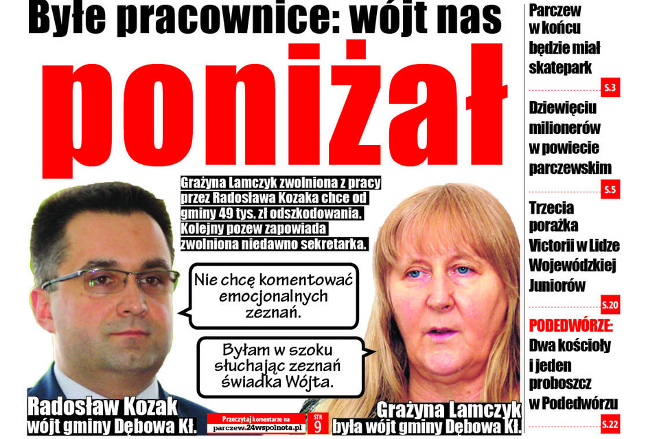 Prawie wszyscy świadkowie pytani o szczegóły zasłaniali się niepamięcią. Twierdzili też zgodnie, że w urzędzie panuje normalna, dobra atmosfera i że nie zaobserwowali żadnych działań i zachowań wójta, które mogłyby poniżyć Grażynę Lamczyk. Ta z kolei uważa, że jednym z przejawów stosowanego wobec niej mobbingu było przydzielenie biurka, na którym stała kserokopiarka i leżał stos dokumentów, co - jak twierdzi - uniemożliwiało jej wykonywanie obowiązków służbowych. Poza fotografiami tego biurka Grażyna Lamczyk złożyła w sądzie płytę z czterema nagranymi rozmowami, które mają potwierdzić jej zarzuty o mobbing. Zapowiedziała też, że dwa kolejne nagrania dostarczy na następną rozprawę.
