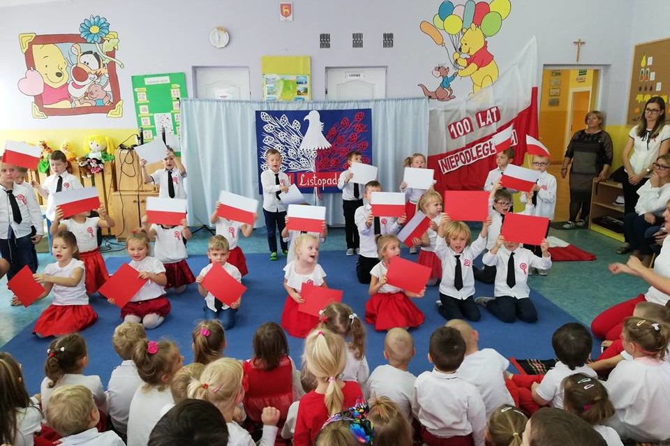 Święto 100 rocznicy odzyskania przez Polskę Niepodległości było szczególnym momentem w życiu przedszkolnej społeczności. Uroczystość rozpoczęła dyrektor Agnieszka Trojanowska, a po wspólnie odśpiewanym hymnie odbyły się wokalno - recytatorskie prezentacje poszczególnych grup. Wiersze i piosenki o Polsce w wykonaniu przedszkolaków brzmiały wzruszająco. Biało – czerwone, galowe i ludowe stroje wychowanków były wspaniałą oprawą dla tego święta. Dyrektor wręczyła dyplomy przygotowane specjalnie na tę okazję. Podziękowała dzieciom za piękne występy, nauczycielom za zaangażowanie w przygotowanie programów artystycznych, przedstawicielom Rady Rodziców za udział w tak ważnym wydarzeniu.
