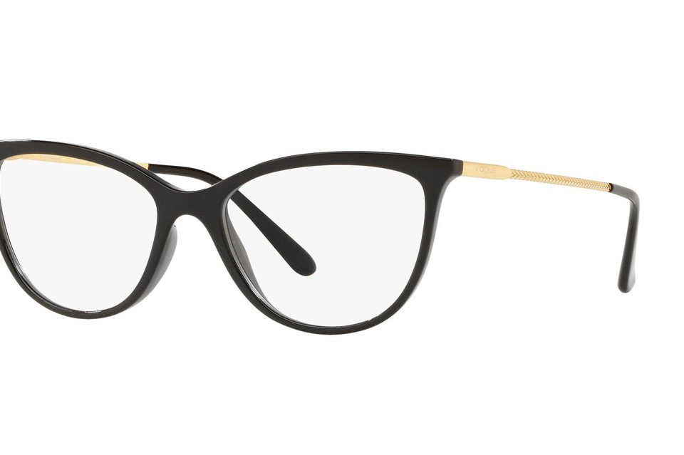 Okulary o „kocim” kształcie w bardzo modnym zestawieniu kolorystycznym czerni i złota,