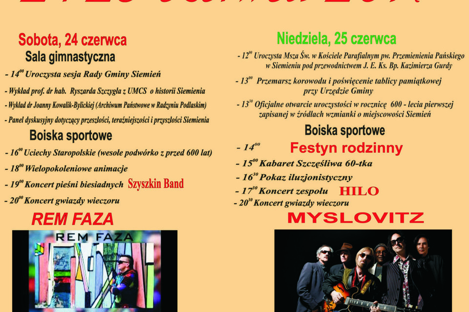 14:00 - Uroczysta sesja Rady Gminy Siemień z wykładami prof. Ryszarda Szczygła oraz dr Joanny Kowalik - Bylickiej o historii Siemienia, oraz panel dyskusyjny przeszłości, teraźniejszości i przyszłości Siemienia.