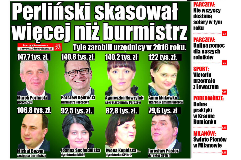 Najlepiej zarabiająca osobą z poniższej listy jest Marek Perliński, prezes zarządu Zakładu Usług Komunalnych. W 2016 roku zarobił 147,7 tys. złotych, to jest o prawie 7 tys. zł więcej niż burmistrz Paweł Kędracki. Następna w kolejności jest Agnieszka Hawryluk, sekretarz miasta, z kwotą 140,2 tysiąca, a tuż za nią skarbnik - Anna Makówka z zarobkami 120,2 tysiąca złotych. Najdroższe nieruchomości, na kwotę prawie 1 miliona złotych, posiada Agnieszka Hawryluk. Nieruchomy majątek Krystyny Kodym, dyrektor Parczewskiego Domu Kultury, przekracza pół miliona złotych.