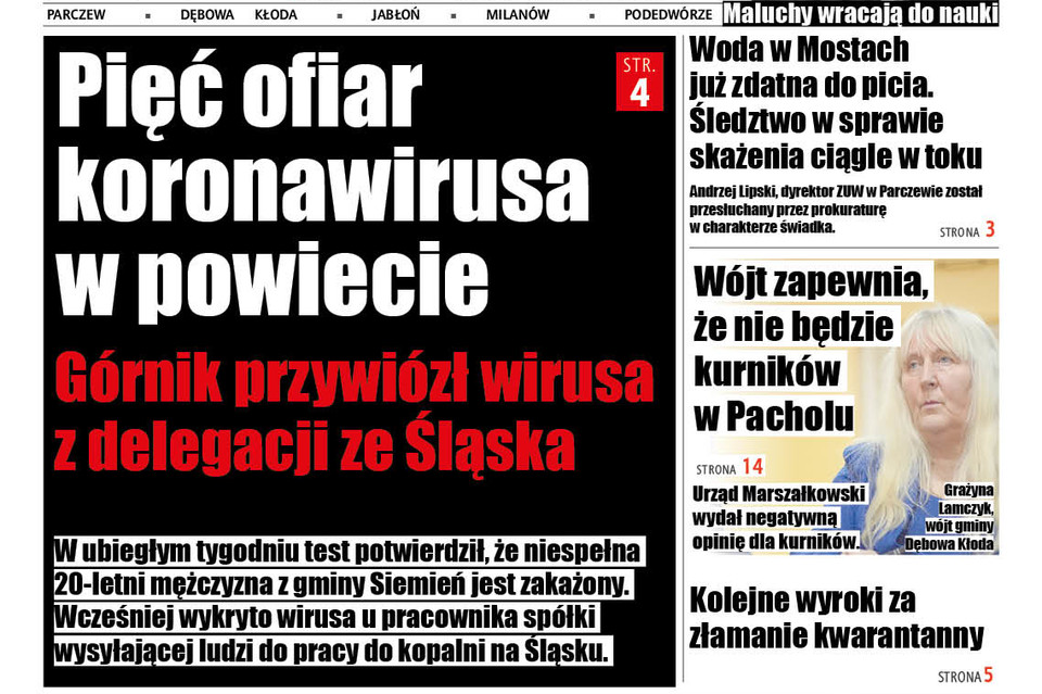 W piątek, 22 maja, służby wojewody poinformowały o czwartym przypadku zakażenia koronawirusem w powiecie parczewskim. To mężczyzna w wieku od 0 do 20 lat. Z nieoficjalnych źródeł wiemy, że ten młody mężczyzna z gminy Siemień jest spokrewniony z górnikiem z łęczyńskiej Grupy Carbon, spółki, która na początku marca oddelegowała do śląskiej kopalni Pniówek 21 pracowników. Od 12 maja 17 z nich jest w izolatorium. Jeden z tych górników to mieszkaniec powiatu parczewskiego.