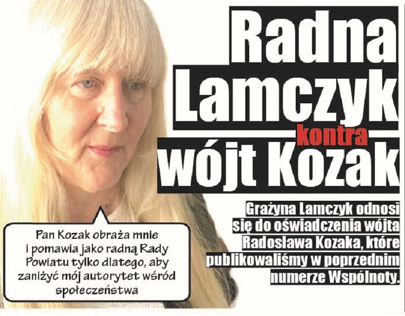 Zdaniem wójta Grażyna Lamczyk, jako radna powiatowa, nie robi nic dla gminy i od 2014 roku, to jest od czasu kiedy przegrała rywalizację o fotel wójta, toczy z nim walkę. - Ja osobiście nigdy nie wypowiadałam się i nie wypowiadam negatywnie na temat pana Kozaka ani jego pracy, wiec nie toczę z tym panem żadnej walki, to ja otrzymuje ciosy, więc się bronię - odpowiada rywalka wójta.