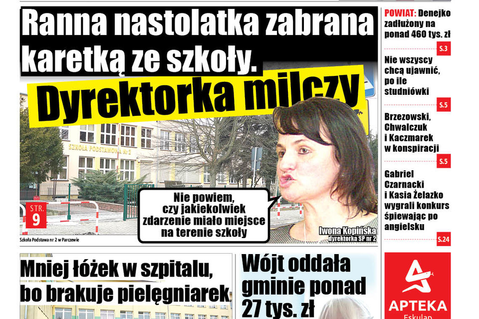 W czwartek, 17 stycznia, przed południem, do jednej z parczewskich podstawówek przyjechała karetka pogotowia. Załoga zabrała stamtąd ranną nastolatkę. Dziewczynka trafiła do jednej z lubelskich placówek medycznych. - Dziecko nie trafiło do naszego oddziału ratunkowego. Zostało przewiezione bezpośrednio do Lublina - powiedział Wspólnocie Janusz Hordejuk, dyrektor parczewskiego szpitala.