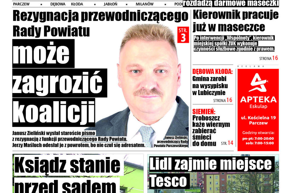 Od wielu miesięcy obserwujemy sygnały wskazujące na konflikt pomiędzy Januszem Zielińskim, przewodniczącym rady powiatu parczewskiego, a starostą Jerzym Maśluchem. Powodem może być lekceważący stosunek starosty do swojego młodszego kolegi partyjnego (PSL). Niemal na każdej sesji Maśluch publicznie poucza Zielińskiego, jak ten ma prowadzić obrady. Nie słucha poleceń przewodniczącego, żeby na przykład mówić do mikrofonu. Wiemy z nieoficjalnych doniesień, że udziela Zielińskiemu reprymend, posługując się przy tym chłopskim językiem.