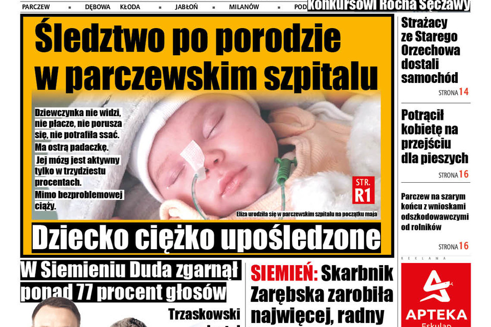 Sprawę ujawnił w ubiegłym tygodniu TVN UWAGA w reportażu pt.: "Zero punktów w skali Apgar. Umiałaś zrobić dziecko? To teraz masz!". Rodzice małej Elizy, która urodziła się w Parczewskim szpitalu na początku maja, opowiedzieli wstrząsającą historię o narodzinach ich pierwszego dziecka. W trakcie porodu doszło do komplikacji. Wykonano cesarskie cięcie. Dziewczynka przez trzy tygodnie walczyła o życie. Z powodu niedotlenienia podczas porodu doszło do zamartwicy. Śledztwo w tej sprawie prowadzi bialski Ośrodek Zamiejscowy Prokuratury Okręgowej w Lublinie. Prokurator prowadząca postępowanie powiedziała "Wspólnocie", że trwa zbieranie dowodów. Prokuratura zabezpieczyła już dokumentację medyczną.