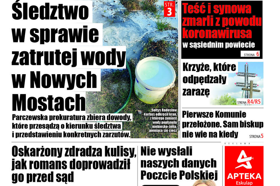 W dwóch poprzednich wydaniach pisaliśmy o zatrutej wodzie w wodociągu w Nowych Mostach w Gminie Podedwórze. Podczas napełniania zbiornika na opryski, do wodociągu dostały się pestycydy.