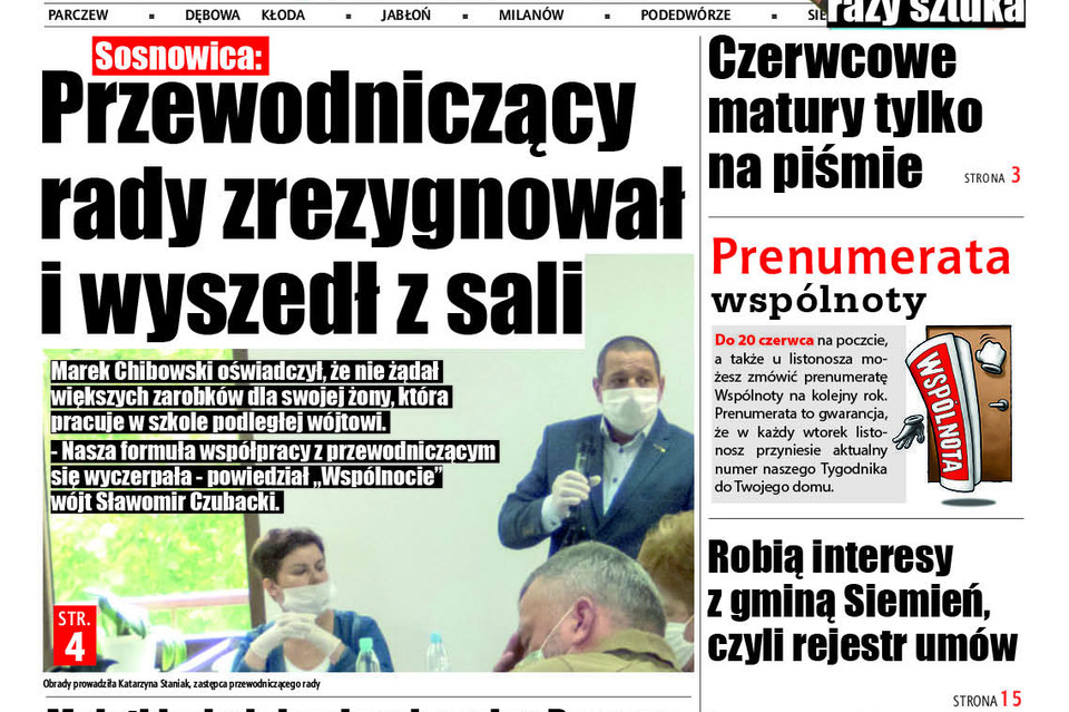 - Na komisjach było bardzo gorąco. Wójt nie może się dogadać z przewodniczącym. Przewodniczący nie może się dogadać z wójtem, z wiceprzewodniczącą. Ja po prostu pełniłem funkcję tak, jak pisze ustawa i statut - rozpoczął piątkową sesję (5 czerwca) Marek Chibowaki, przewodniczący Rady Gminy Sosnowica. - Powiem tylko w skrócie, żeby się nie rozpowiadać. Nigdy nie chodziło mi o zarobki mojej żony, żeby były wyższe. Nigdy nie zabiegałem o takie względy co do mnie, bo ja mam pracę i nie oczekuję żadnej innej pracy ani w bibliotece, ani nigdzie indziej. Po prostu jestem sobą i zostanę sobą. Składam rezygnację z przewodniczącego Rady Gminy Sosnowica - zakończył swoje oświadczenie Chibowski i opuścił salę.