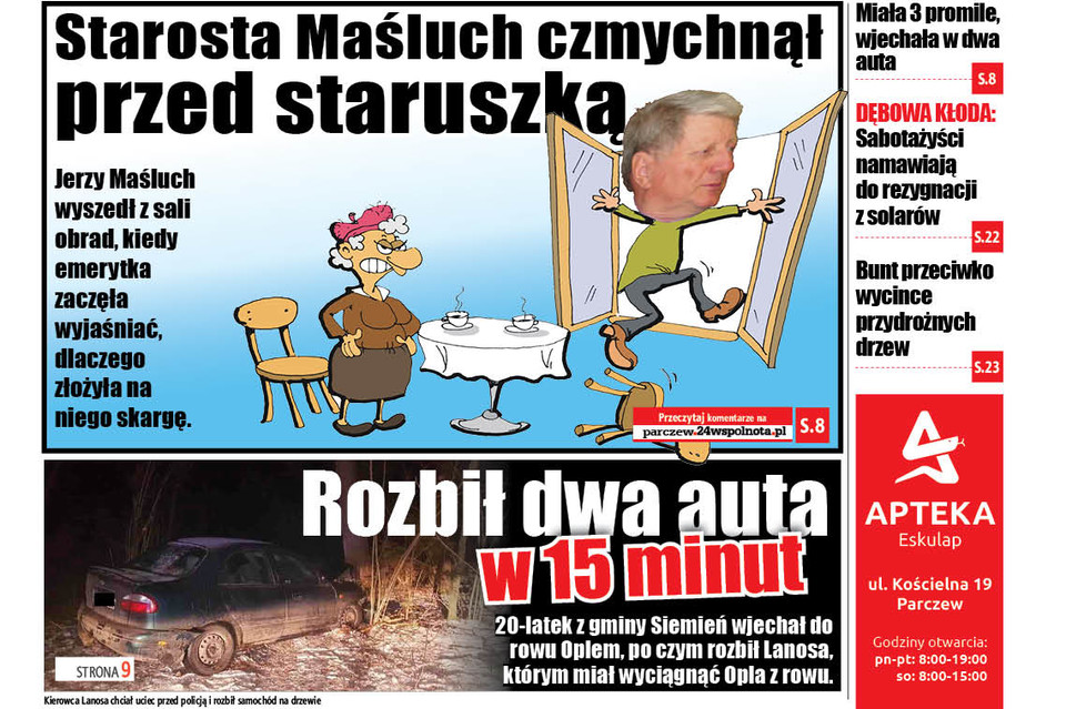 Eugenia Kowalska, była pracownica Rolniczej Spółdzielni Produkcyjnej w Parczewie, wniosła skargę na starostę parczewskiego, bo, jak twierdzi, Jerzy Maśluch nie chce wypłacić jej 33.000 złotych, na które ma wyrok sądu. Skarga była przedmiotem obrad na sesji Rady Powiatu 15 lutego. Tuż przed rozpoczęciem punktu poświęconego skardze, starosta wyszedł z sali obrad.