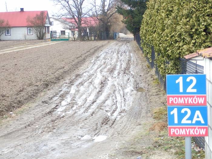 Za tabliczką Pomyków stoi kilka samochodów. Tu widać błotnistą drogę prowadzącą do posesji. W oddali widać, jak starsza kobieta prowadzi rower. Po kilkunastu minutach dociera do szosy. Wsiada na rower i jedzie w stronę sklepu.
