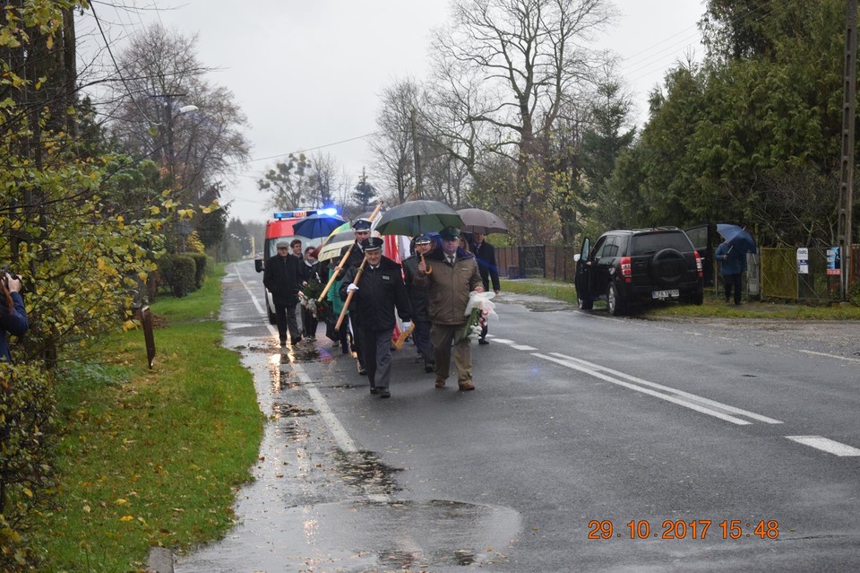 Następnie w strugach ulewnego deszczu kolumna pocztów sztandarowych, mieszkańców wsi i gości przeszła od kaplicy do pomnika upamiętniającego tamte wydarzenia.