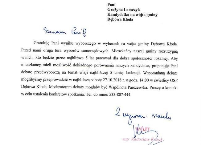 KulturaRadosław Kozak, obecny wójt i kandydat do tego urzędu w nadchodzącej kadencji, zaprosił Panią Grażynę Lamczyk, swoją konkurentkę wyłonioną przez wyborców do udziału w II turze wyborów, na debatę pod tytułem: "Porozmawiajmy o przyszłości Gminy Dębowa Kłoda."