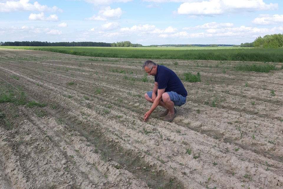 Rolnik pokazuje otwory w glebie w miejscach, gdzie rosły źdźbła kukurydzy. Chwilę chodzi po polu i znajduje kilka roślin. Wyjmuje z ziemi jedną i pokazuje w całości. Poza zieloną naziemną częścią widać ziarno kukurydzy, z którego wyrasta roślina oraz niewielki system korzeniowy. - Te żurawie gnieździły się i żerowały w pobliskim Rezerwacie Przyrody Warzewo. W Regionalnej Dyrekcji ochrony Środowiska powiedzieli mi, że była afera z tym rezerwatem. Ktoś wjechał tam jakimś ciężkim sprzętem, spychaczem i zniszczył te siedliska. No i te żurawie gdzieś muszą się podziać. Powiedzieli mi też, że w tym roku odnotowali siedem podobnych zgłoszeń. Rolnicy chcą dostać pozwolenie na używanie armatek hukowych, które miałyby odstraszać ptaki – opowiada Tadeusz Kaczejko.