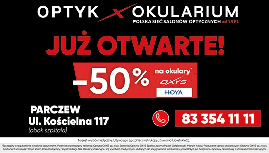 Już od 9 maja Optyk Okularium jest otwarty dla Ciebie w nowej lokalizacji ul. Kościelna 117 Parczew. Do końca czerwca obowiązuje specjalna oferta promocyjna -50% na okulary marki Oxys.