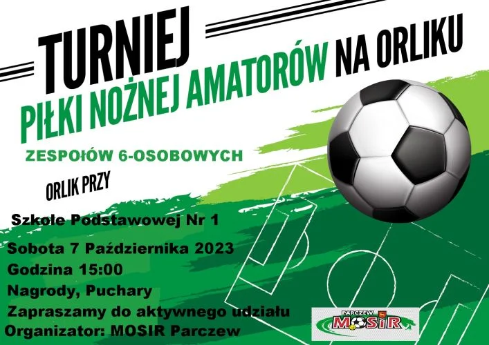 Impreza odbędzie się 7 października od godz. 15:00 na Orliku przy Szkole Podstawowej nr 1 w Parczewie. Zgłoszenia do turnieju należy kierować pod numerem tel. 83 355 12 51 do 6 października do godz. 15:00 lub bezpośrednio przed zawodami na miejscu imprezy.