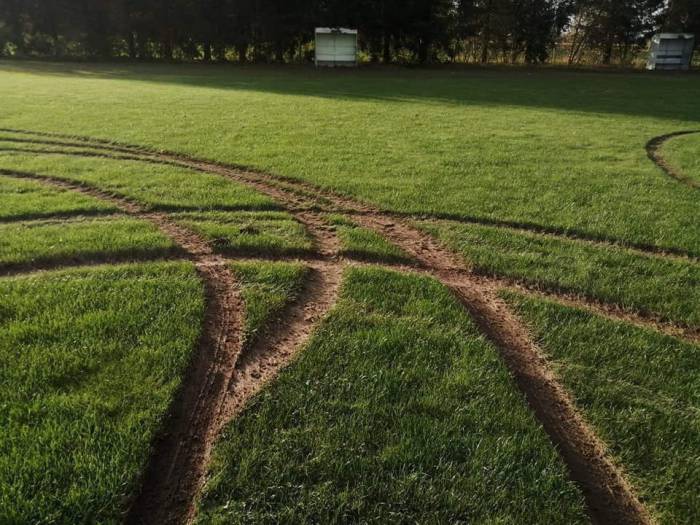 Murawa boiska przy Szkole Podstawowej im. Armii Krajowej w Dębowej Kłodzie została dosłownie zaorana oponami samochodu, który wjechał na grząską płytę. "Rajdowiec" dokonał dzieła zniszczenia w nocy z 18 na 19 października 2020 roku.